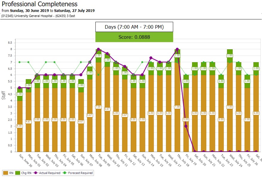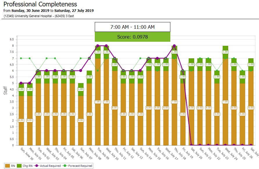 The Professional Completeness metric indicates how well the professional staff assignments within a schedule meet staffing requirements as defined by the Department Staffing Matrix and Forecast Census for